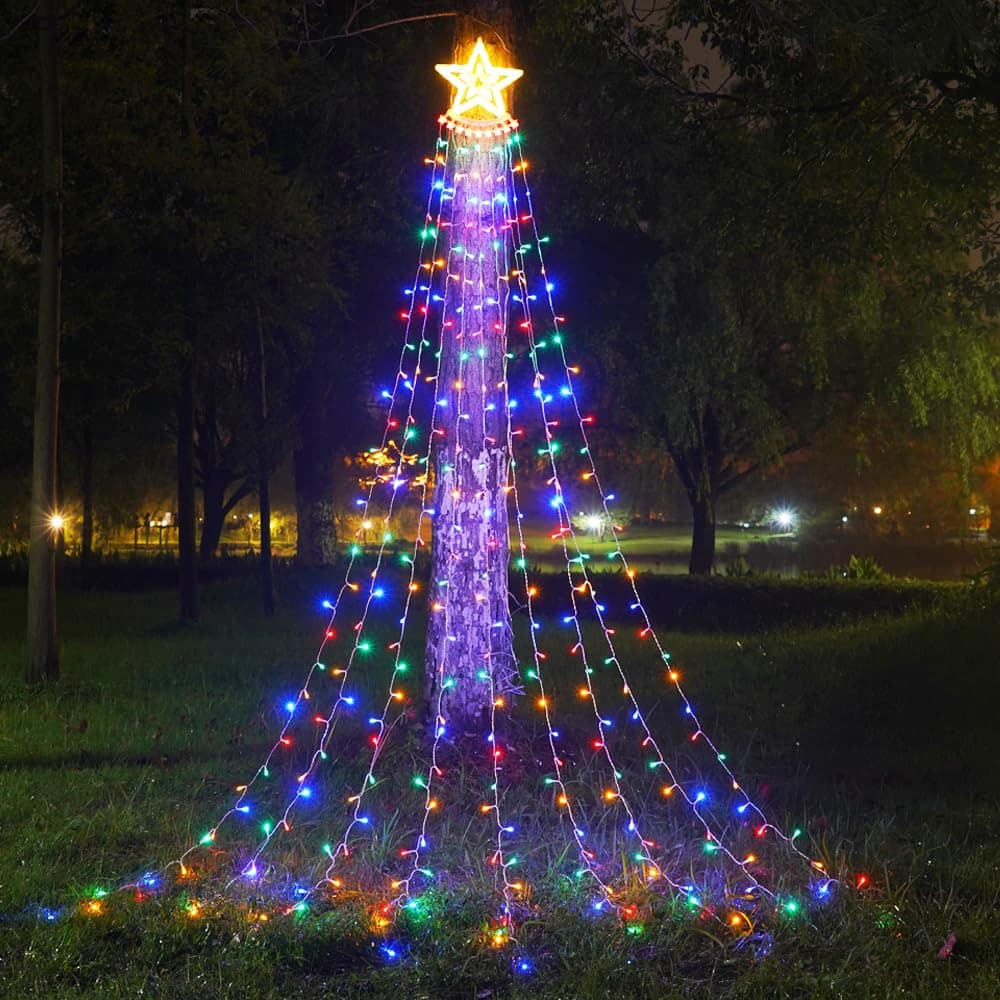 Su instalación es sencilla: solo fija la estrella en la parte superior (pared, árbol o estructura) y deja que las tiras caigan de manera uniforme. Disponible en modelos con enchufe o solar, y con o sin control remoto para elegir distintos modos de iluminación.