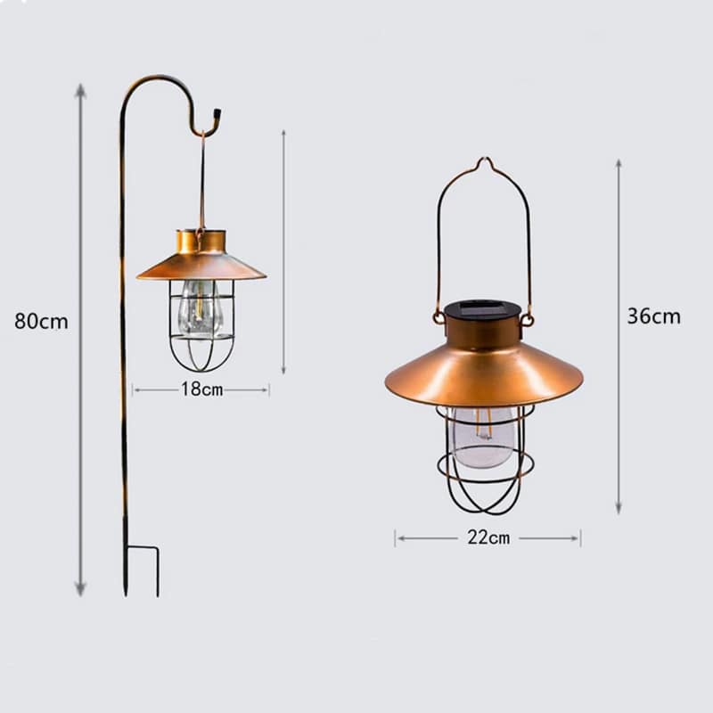Su estructura simula el diseño clásico de lámparas antiguas, mientras que la luz LED cálida que emite crea una atmósfera acogedora al anochecer. No necesita cables ni instalaciones: se carga durante el día con energía solar y se enciende automáticamente al caer la noche.
