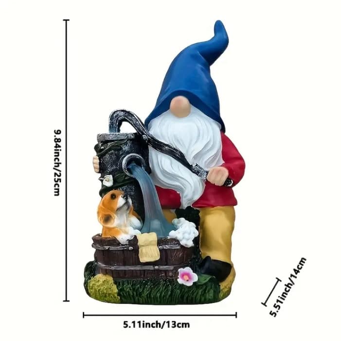 El Gnomo Azul con Bomba de Agua y Cachorrito es una pieza decorativa que llenará tu jardín de encanto y personalidad. Con su gorro azul puntiagudo, barba blanca y gesto simpático, este gnomo sostiene una antigua bomba de agua mientras acompaña a un tierno cachorro que juega en un barril.