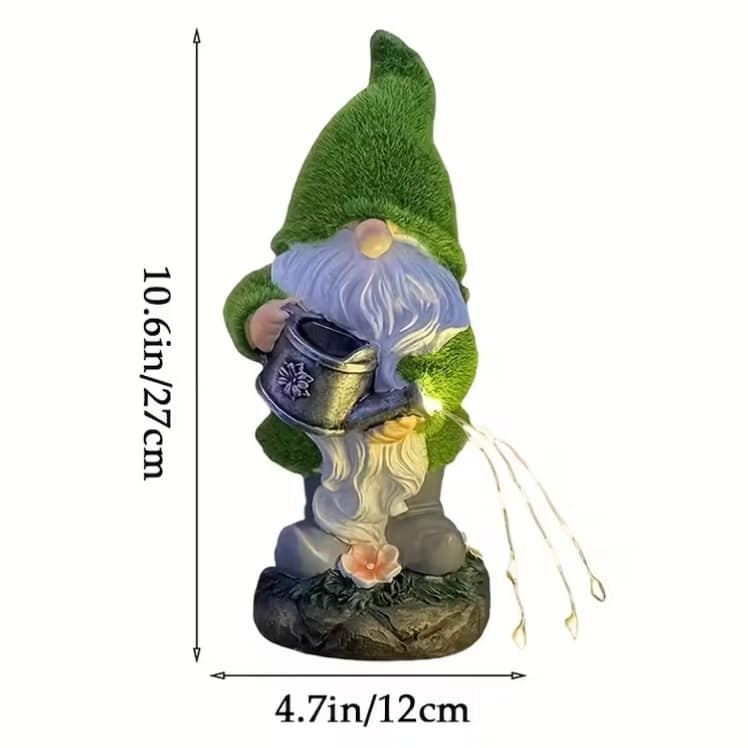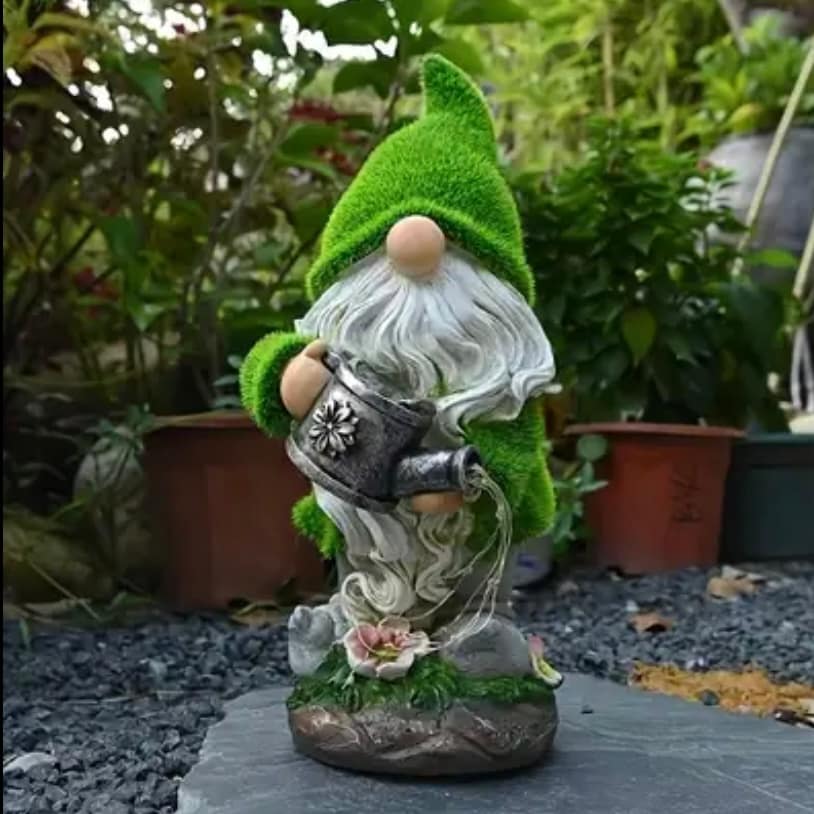 El Gnomo Regadera Solar es el complemento ideal para dar vida y personalidad a tus espacios exteriores. Con su clásico gorro verde y barba blanca, este simpático gnomo sostiene una regadera que cobra vida gracias a la iluminación LED en forma de chorros de agua, creando un efecto encantador al anochecer.